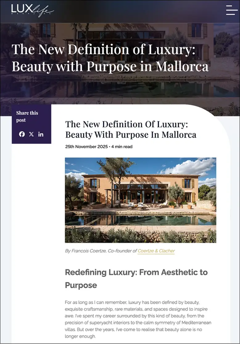 Luxury today is no longer defined solely by beauty or craftsmanship, but by intention. Francois Coertze reflects on a shift happening across Mallorca – and beyond – where people increasingly seek spaces that don’t just look extraordinary but contribute meaningfully... Read More